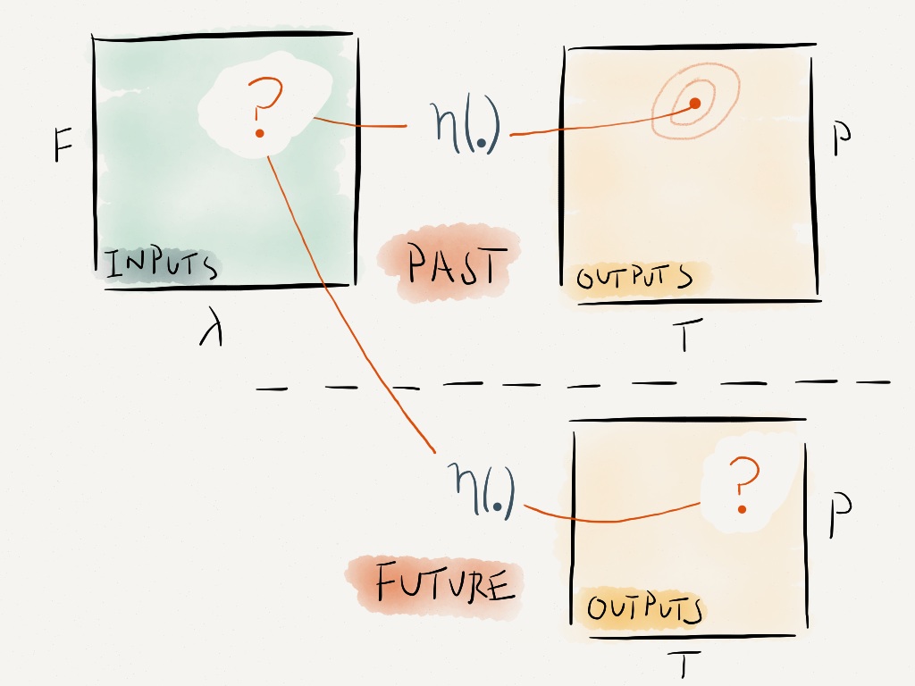 Figure 3. Projections of future climate can be constrained by matching the output of the model to historical observations, and projecting forward the resulting regions of input space. Here, gf(.) is the climate model that represents future climate processes.