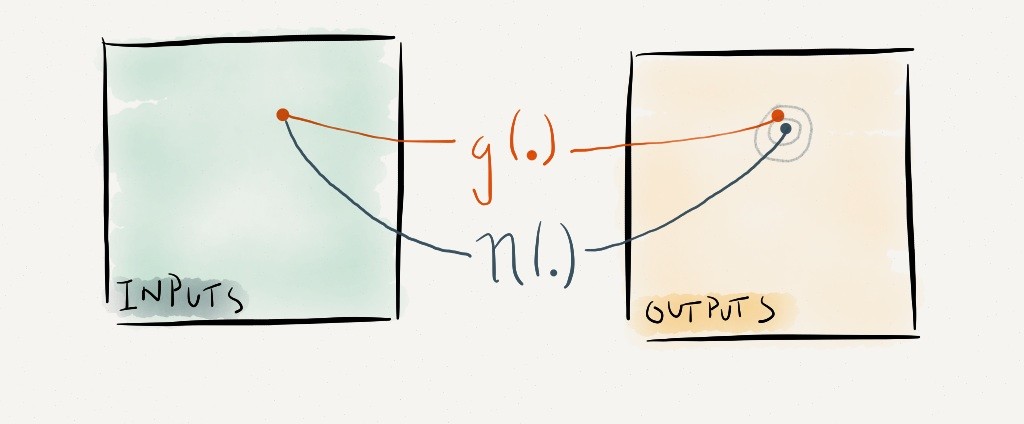 Figure 2. Observation uncertainty implies input uncertainty. If an observation falls within the red rings in output space, this implies a plausible region of input space.