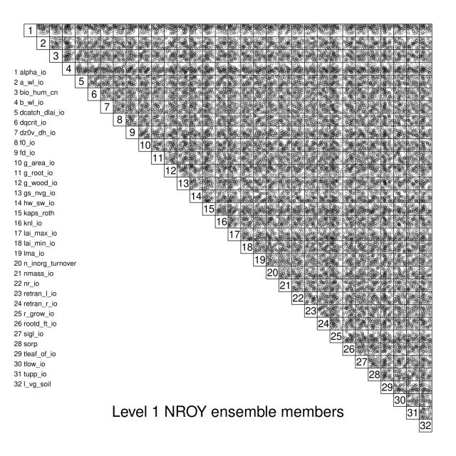 This time, we look at a pairs plot of the ensemble members that pass the level 1 constraint – those that are “Not Ruled Out Yet” (NROY, a concept borrowed from history matching) .