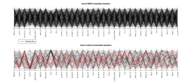 Each vertical axis represents the range of a particular parameter and an ensemble member traces a line along the plot, with the height on each axis representing it’s position in input space. For example an ensemble member that was exactly in the middle of the ensemble (0.5, 0.5, 0.5, 0.5 …) would show up as a horizontal line across the middle of the plot.